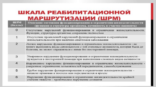 Данный критерий для медицинской реабилитации базируется на использовании международной модифицированной шкалы Ренкина. Шкала реабилитационной маршрутизации является универсальным критерием, применимым для всех возрастных групп и будет выражаться в баллах.